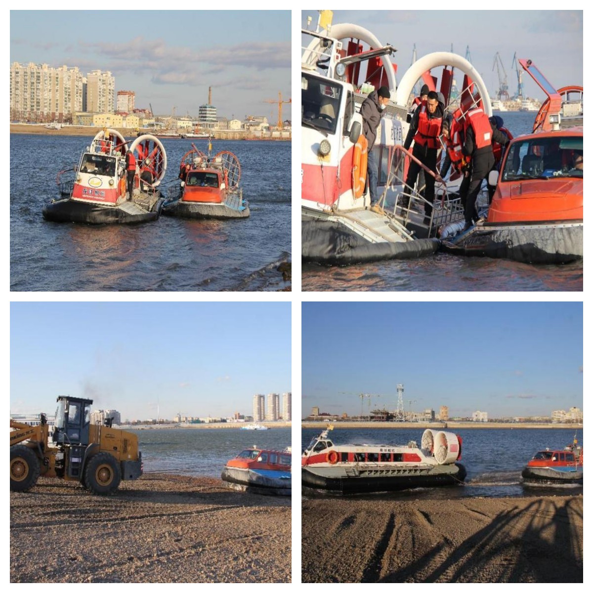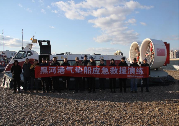 此次應急救援演練模擬中國籍氣墊船從俄羅斯布拉戈維申斯克市口岸返回中國黑河口岸途中,由于船舶失去動(dòng)力無(wú)法繼續航行,被困于冰面上。黑河港客運保障隊收到求助后,立即啟動(dòng)氣墊船運輸應急救援預案,派遣“征程1號”氣墊船迅速前往事故地點(diǎn)過(guò)駁旅客,將拖帶纜繩運送至遇險船舶進(jìn)行系固,岸上裝載機將遇險船舶拖拽回中方口岸安全區域。最終遇險的6名旅客和3名船員成功獲救。